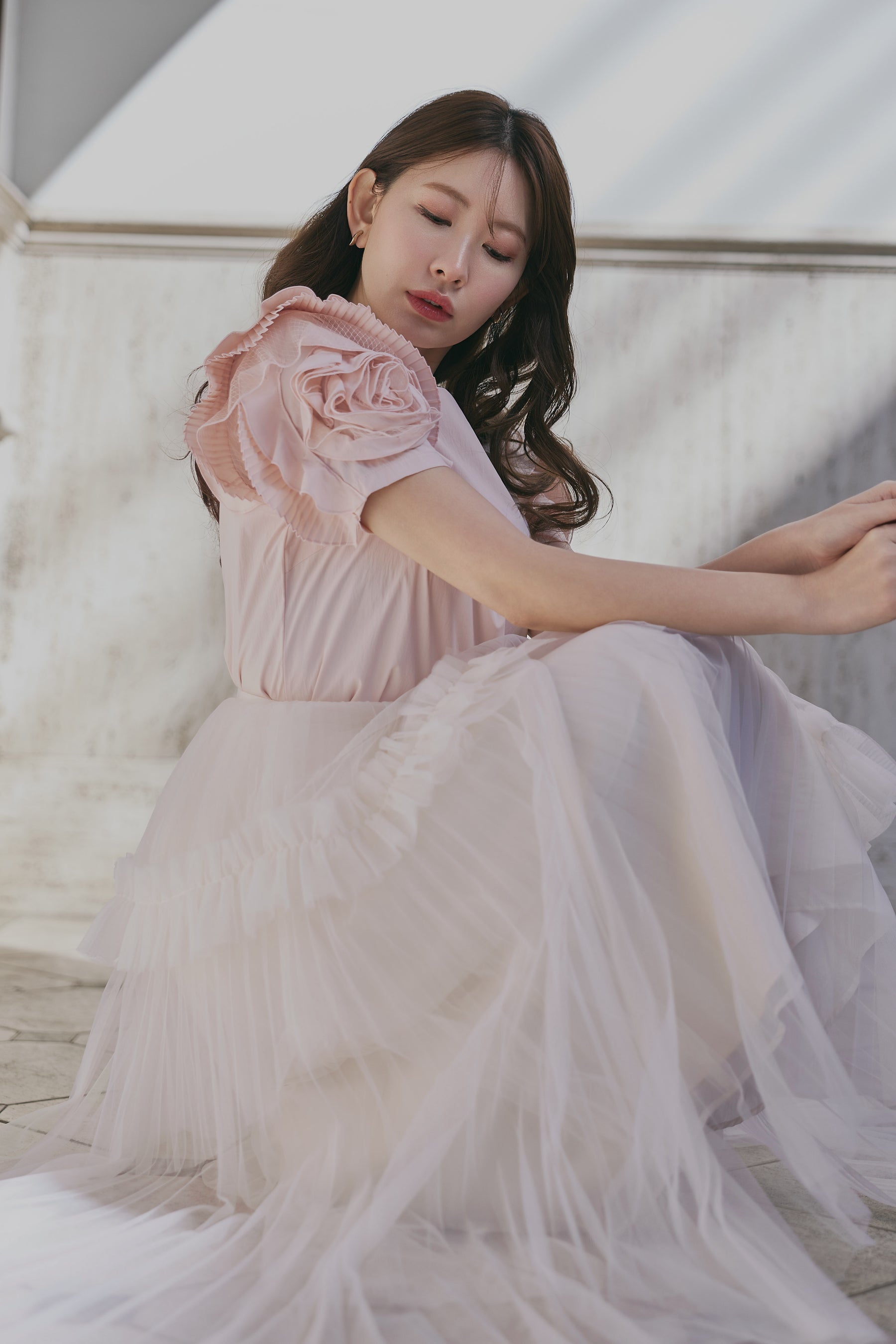 繊細なナイロンチュールとシアーなオーガンジーを重ねることで、奥行きのある色の深みを表現しました。