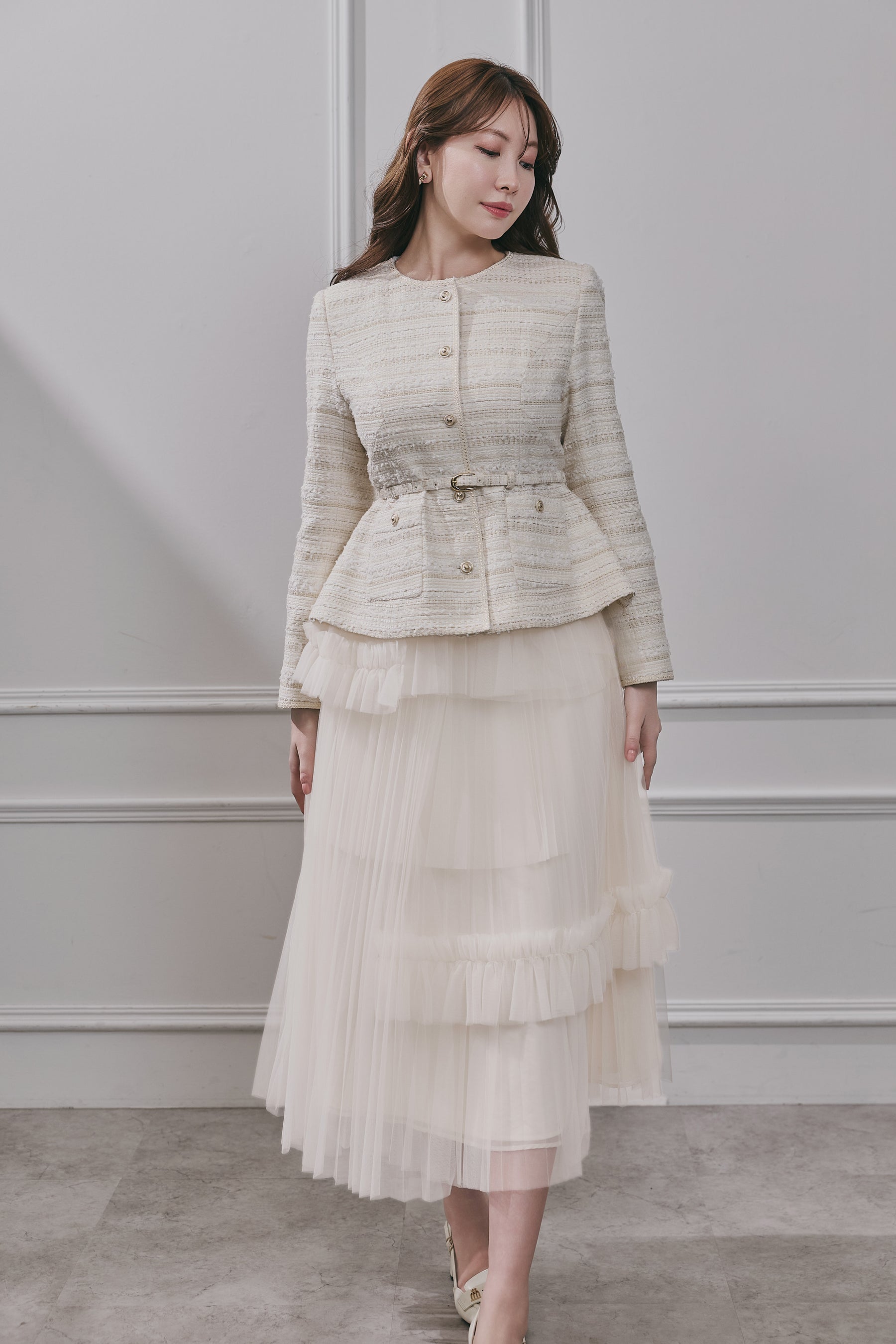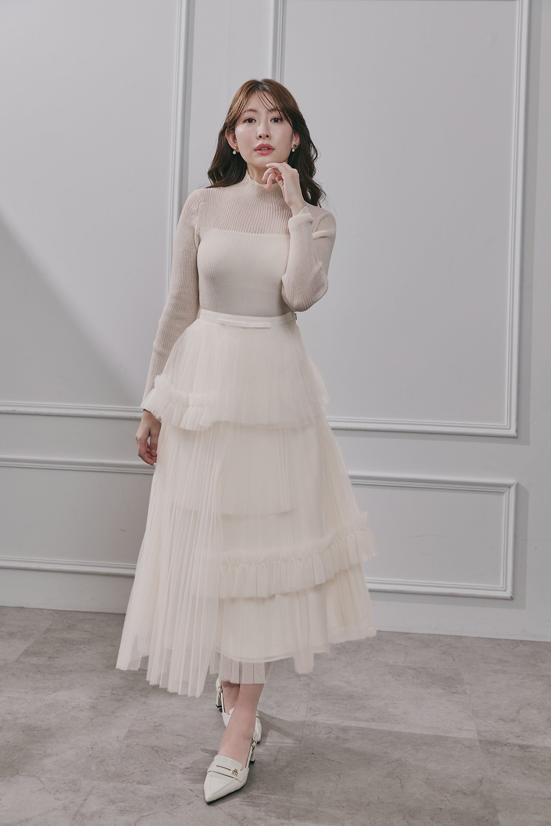 チュールの重なりが生むドラマティックなボリュームが美しいスカート。