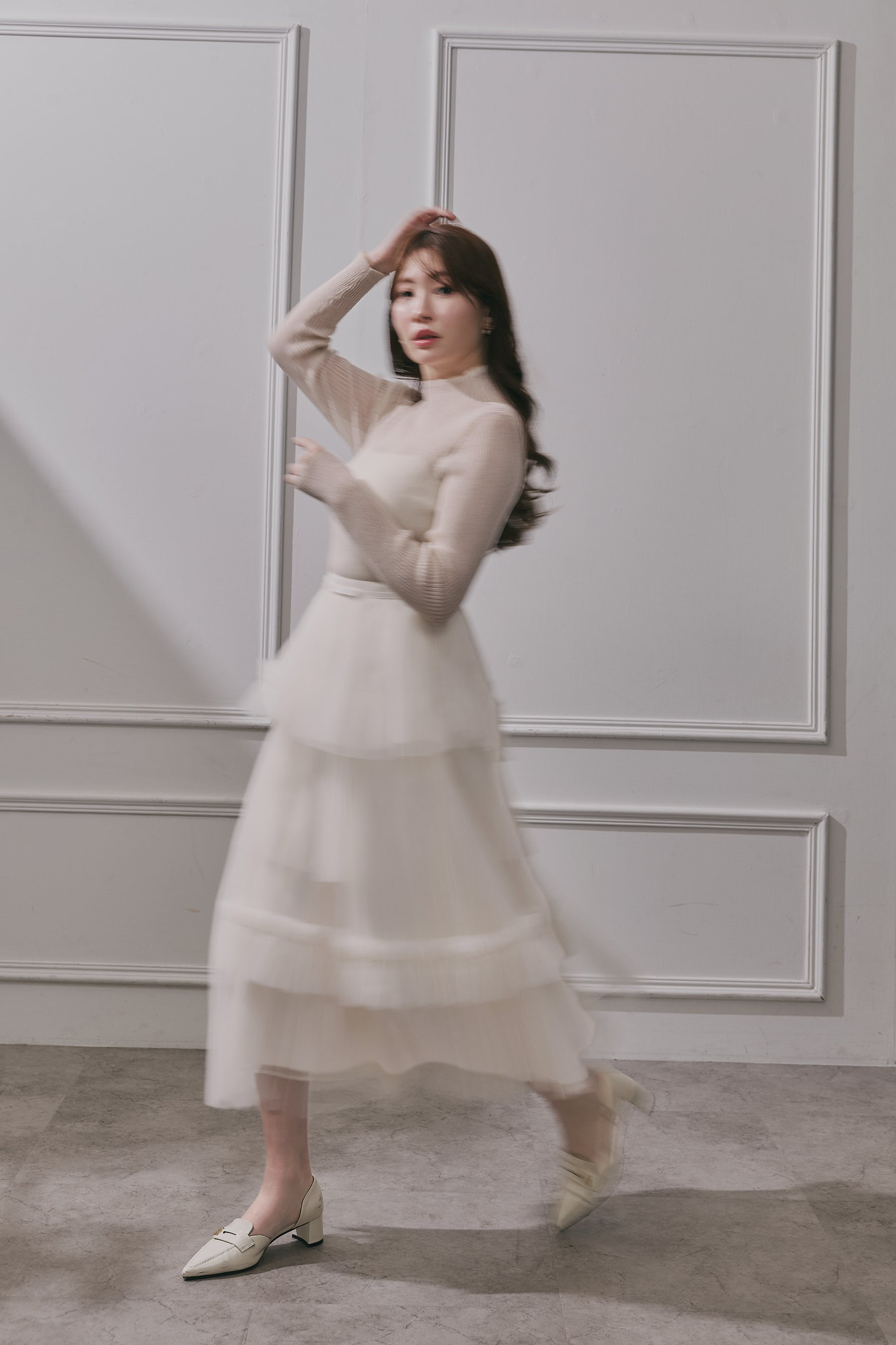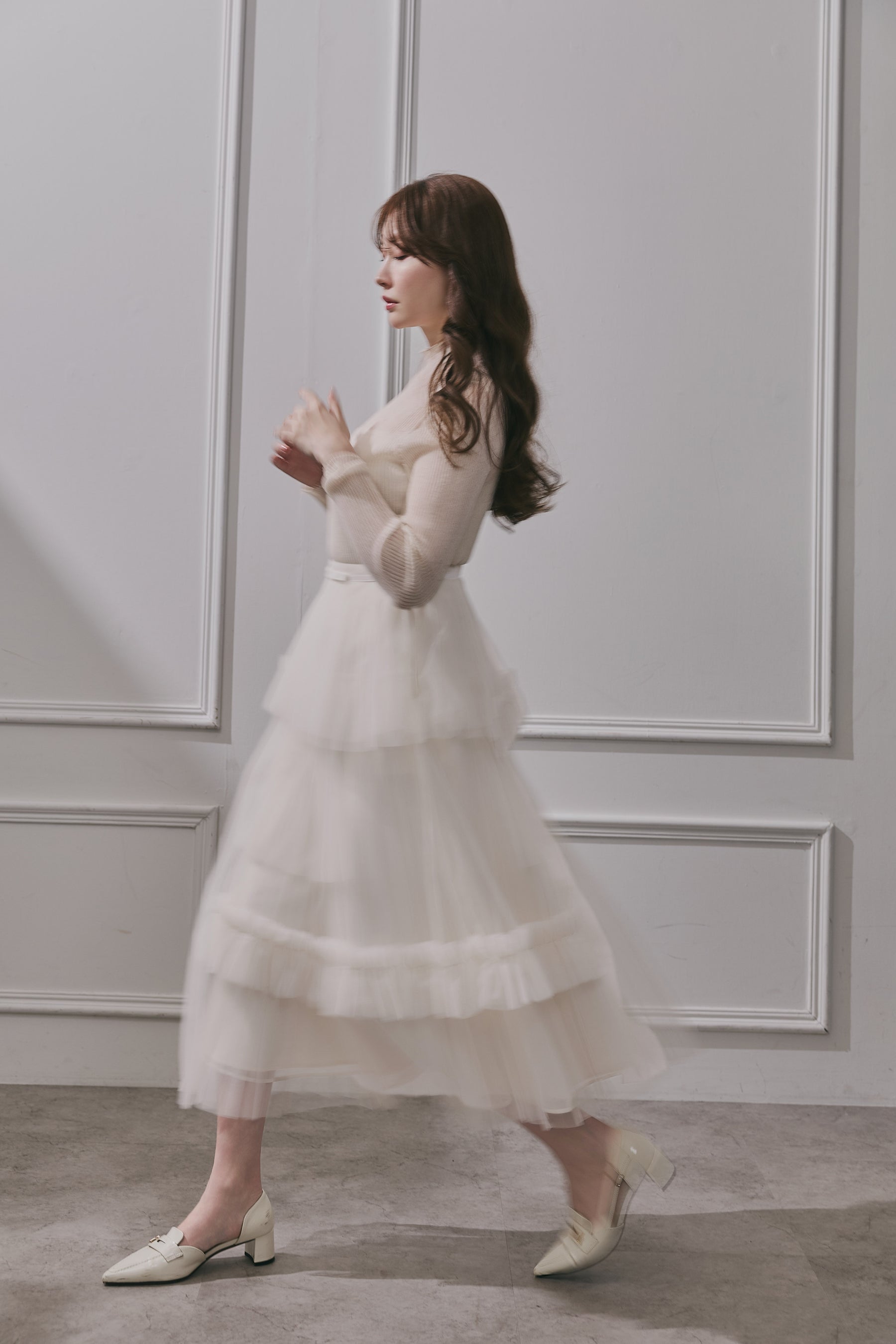 異なる透け感が重なり合い、歩くたびに陰影が揺れ動きます。